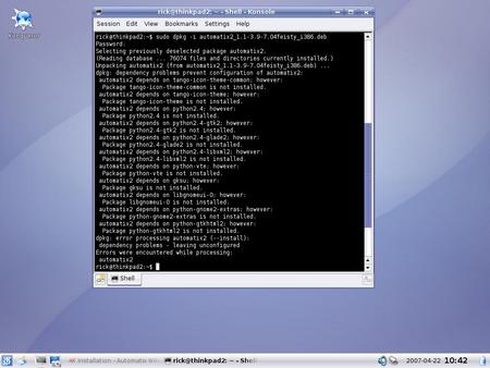 Dpkg balks at my attempt to install Automatix2 (Click to enlarge) To complete the Automatix2 install (and remedy the aforementioned "dependency problems"), type in the following additional pair of commands at Konsole's command prompt: