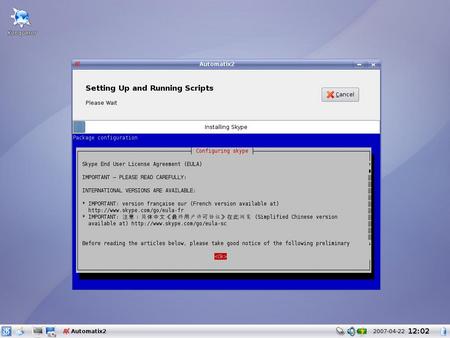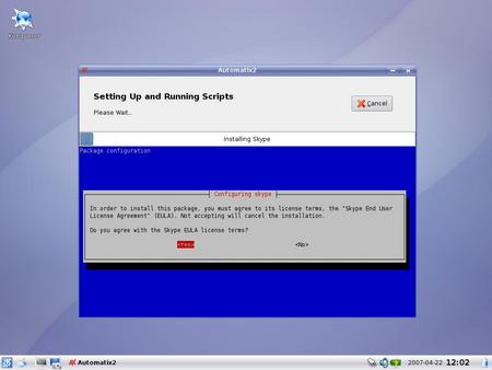 During the installation of some of these applications by Automatix2, the process will occasionally present screens that need responses. In some cases, you need to press Tab or the right/left arrow keys on your keyboard to "highlight" the desired response (it gets a red background), and then press the Enter key to allow the installation to proceed. An example from Skype installation appears in the following screenshots.