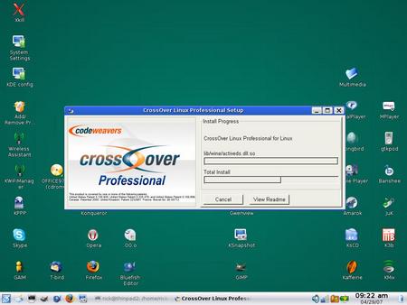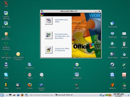 As you may have noticed from my finished Feisty Fawn desktop (above screenshot), I also installed Crossover Linux 6.01, downloaded from Codeweavers.com, and used it to add an tattered old copy of Microsoft Office 97 to my Feisty Fawn desktop, as illustrated in the following two screenshots.