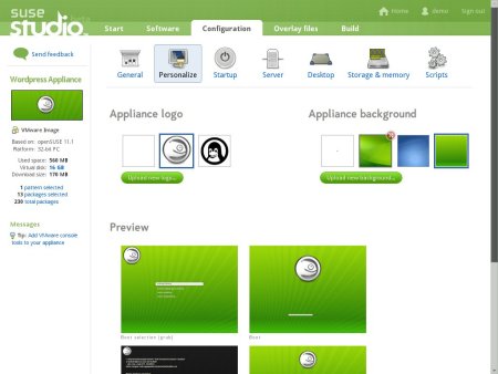 SUSE Studio appliance personalization features (Click to enlarge) SUSE Studio is part of Novell's SUSE Appliance Program, which eWEEK describes as an initiative intended to streamline product delivery and maintenance for ISVs by enabling them to bundle their wares with everything required for direct deployment to virtual, physical, or cloud-based infrastructure.