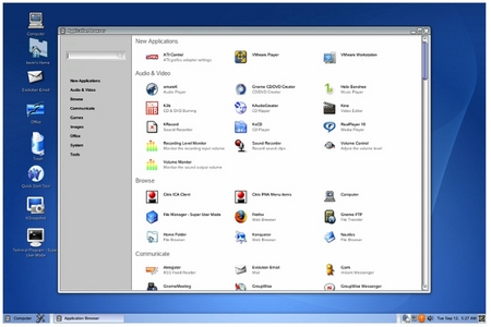The default Gnome desktop makes the Simpson Desert look lush. All you see are couple of folders on the screen and a My Computer button in the bottom taskbar, next to a pencil. 'My Computer' turns out to be the 'Start' button. It opens a screen offering a few apps, a 'More Applications' button and pointers to things like Help and Control Centre. The More Apps button goes to other extreme and opens a leatherbound volume of 160 programs: 21 office applications, 9 browsers/file managers, 10 communications tools, 10 graphics programs, 15 audio/video programs, 50 system utilities and 28 tools. There are group headings on one side, but you get the entire Carte des Vins on the right. When you click a heading, it colours in the related group but it still takes too long to find what you want.