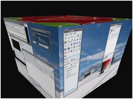 Not bad. CTRL+ALT+ right-clicking on the desktop with the mouse lets you move the whole cube in space, in any direction. Shift +CTRL+ALT+right+left cursor allows you to drag an open panel across to the next side of the cube. And if you get lost among all the cubic desktops, you can hit CTRL+ALT+ down cursor and see all the screens at once in 2D.