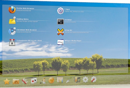 According to Bennett, the launcher is also more "theme-able" compared to UNR 9.10's Clutter UI. By modifying the "edje" declarative layout format, users can "completely change the way the UI looks." For example, the screenshot shown below is said to be based on the same code as the screen above, but uses a different theme file, writes Bennett.
